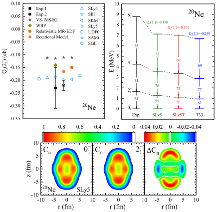 该工作使用超Skyrme-Hartree-Fock方法,研究了20Ne第一激发态2_1^+的大电四极矩Qs。计算得到的Qs约为-0.20 eb,与实验值-0.22(2)eb非常接近,通过分析局域化函数确认该态中α团簇结构的存在。此外,还探讨了张量力对α簇结构的影响,发现张量力显著增强了Qs并加强了沿对称轴的团簇结构。