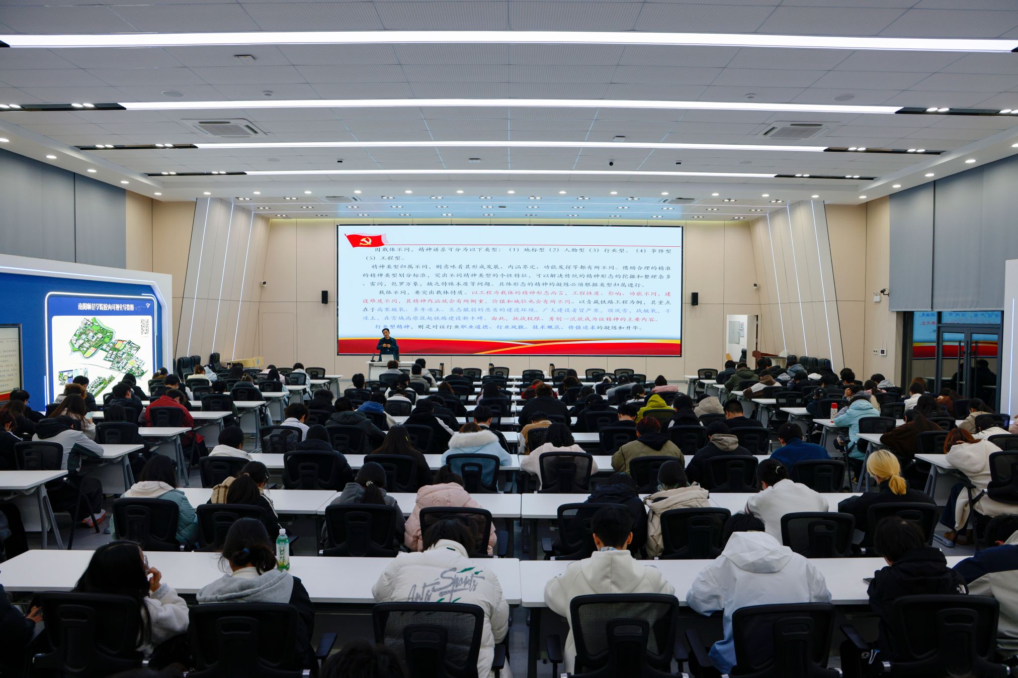 本网讯(文蔓芝/文 伍琦琪/图)12月8日晚,我校以“胸怀千秋伟业,恰是百年风华——中国共产党人精神谱系”为主题的道德讲堂在科技楼一楼报告厅举办。本次宣讲由党委宣传部、学生处牵头,马克思主义学院副院长焦金波担任主讲,全校学生代表200余人参加。