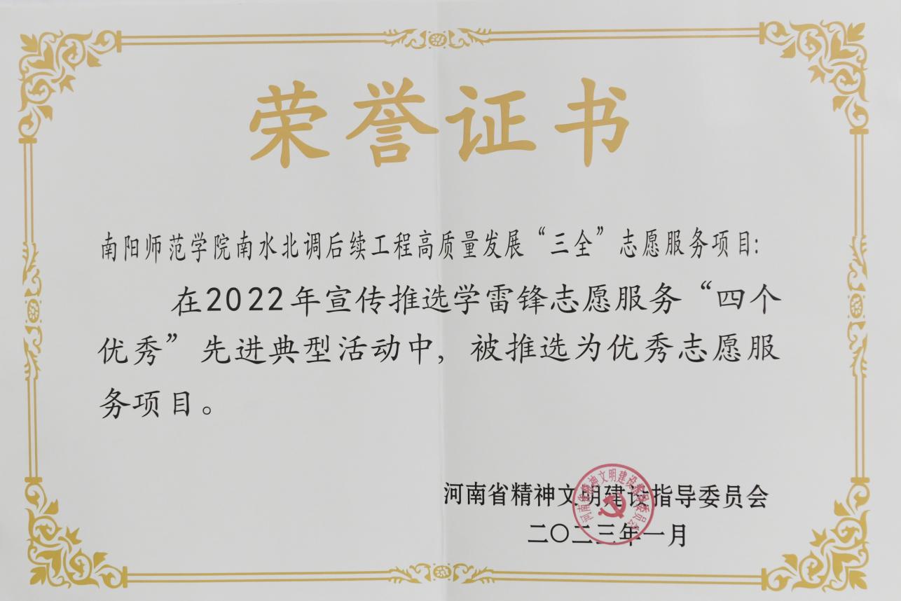 学校连续三届蝉联“全国文明单位”荣誉称号,“南水北调中线水源区生态环保志愿服务项目”和“科技支农志愿服务项目”先后被评为全国学雷锋志愿服务最佳项目。“南水北调中线渠首护水志愿服务项目”分别荣获第六届中国青年志愿服务项目大赛银奖和水利专项赛一等奖。育人品牌“卧龙文化艺术节”已坚持22年,并获河南省第二届普通高等学校校园文化建设优秀成果一等奖,“道德讲堂”入选全国高校思想政治工作精品项目,“传承经典立德树人”传统文化育人工程入选全国高校礼敬中华优秀传统文化示范项目。