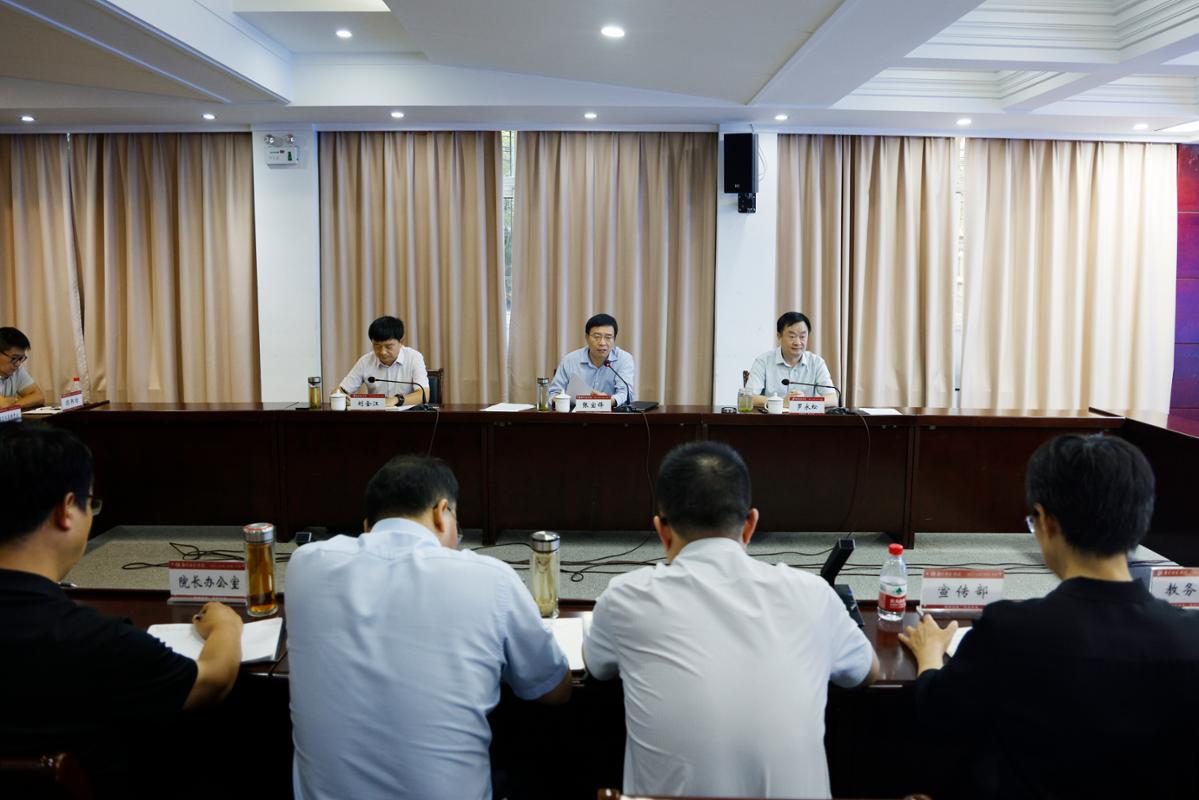 本网讯(吴春刚/文 杨静慧/图)7月30日下午,我校在办公大楼一楼东会议室召开淅川校区工作推进会。校党委书记张宝锋、校长罗永松、副校长刘金江出席会议,相关单位主要负责人参加会议。会议由刘金江主持。