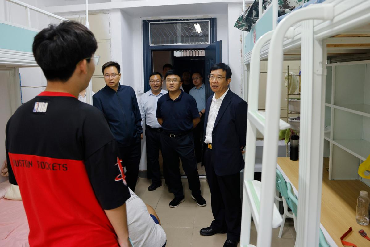 在东区学生宿舍,张宝锋一行实地查看了宿舍环境和生活设施配备情况,并与入住的新生亲切交谈,询问他们初入校园的感受,叮嘱同学们要尽快适应大学生活,合理安排时间,养成良好的学习和生活习惯,在这片充满希望的校园里开启人生新征程,追逐青春梦想,同时要求相关部门要切实做好后勤保障工作,为学生创造良好的学习生活环境。