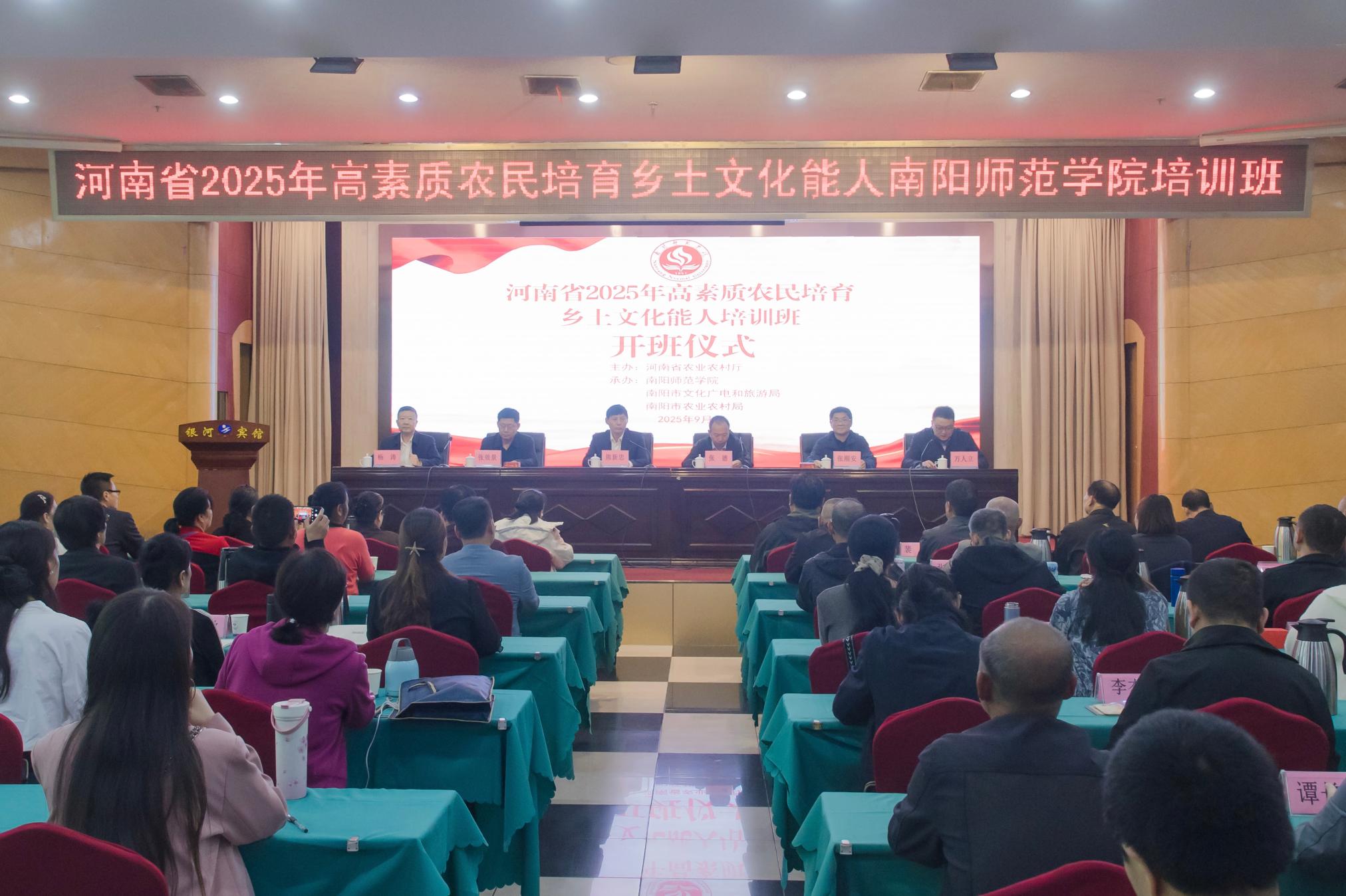 本网讯(通讯员 万人立 图/文)9月19日上午,由河南省农业农村厅主办,华亿体育登录、南阳市文化广电和旅游局、 南阳市农业农村局共同承办的“河南省2025年高素质农民培育乡土文化能人培训班”开班仪式在南阳市银河宾馆举行。华亿体育登录副校长熊新忠,南阳市文化广电和旅游局党组成员、副局长张效景,南阳市农业农村局党组成员、副局长张德及我校继续教育学院相关负责同志出席。