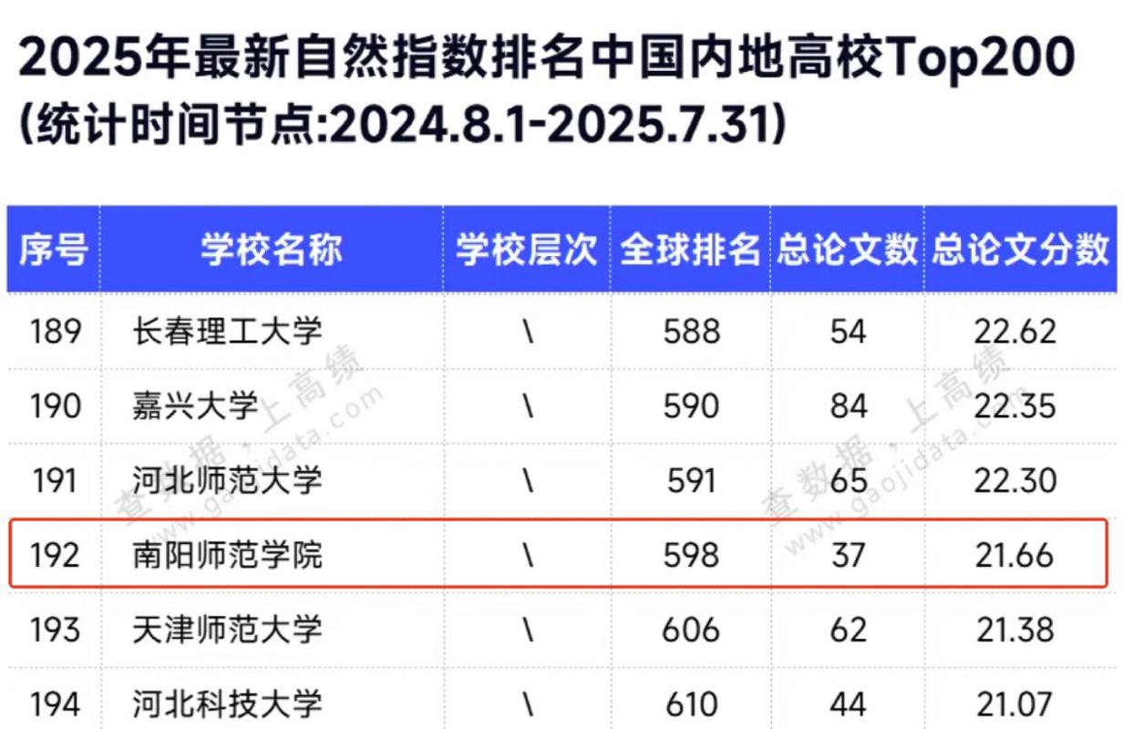 本网讯(通讯员 张浩 郑扬冰)日前,自然指数官网更新了最新排名(统计时间节点:2024.8.1-2025.7.31),我校省内排名仍稳居第4名,内地高校排名上升至第192名,首次突破前200名,在学院类高校中名列前茅。这一突破性进展标志着我校在自然科学基础研究领域取得显著进步,学术影响力大幅提升。