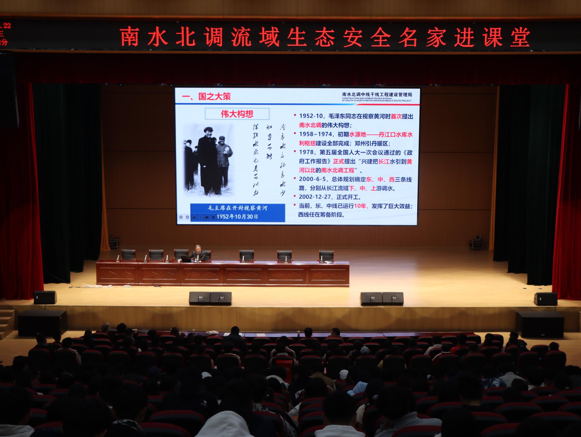 刘宪亮教授以《南水北调 国之重器》为题,从国家水安全战略维度系统阐释了南水北调工程的重大意义,引导学生树立以国家需求为导向的学习观和价值观。