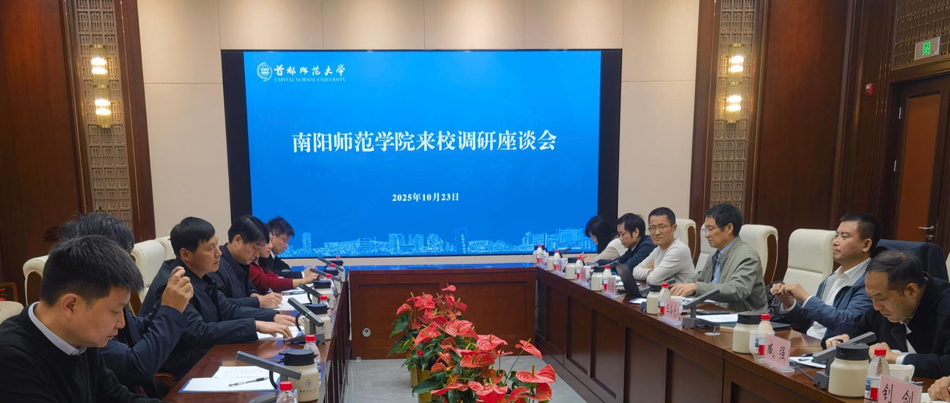 10月23日上午,熊新忠一行来到首都师范大学,与该校副校长王洛忠,人事处、招生就业处、研究生院、国内合作处及相关学院主要负责人举行座谈。王洛忠对熊新忠一行表示欢迎,并介绍了该校沿革历史、学科和专业建设现状、毕业生规模与就业等情况。熊新忠就我校区域优势、办学特色、学科布局及高层次人才引育政策作了全面介绍。双方围绕人才协同引进、高水平师资队伍建设、研究生联合培养等议题深入交流,在多方面达成一致意见。