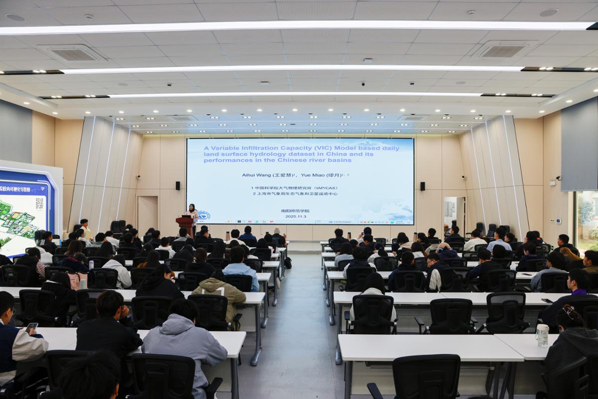 Dennis Patrick Lettenmaier教授以“气候与水文研究热点”为题作学术报告,聚焦美国西部水文情势变化,深入剖析了极端洪水趋势、区域径流演变及“气候鞭挞效应”等前沿科学问题,为理解气候变化背景下的水文响应机制提供了重要视角。王爱慧研究员介绍了基于VIC模式构建的中国区域高分辨率逐日陆面水文数据集,为相关领域的灾害防控与科学决策提供了关键数据支持。我校地理科学与旅游学院闫崇宇博士、吕律博士也分别就干旱对森林碳通量的影响机制及农田生态修复等研究方向作了精彩分享。(编审 张君明)