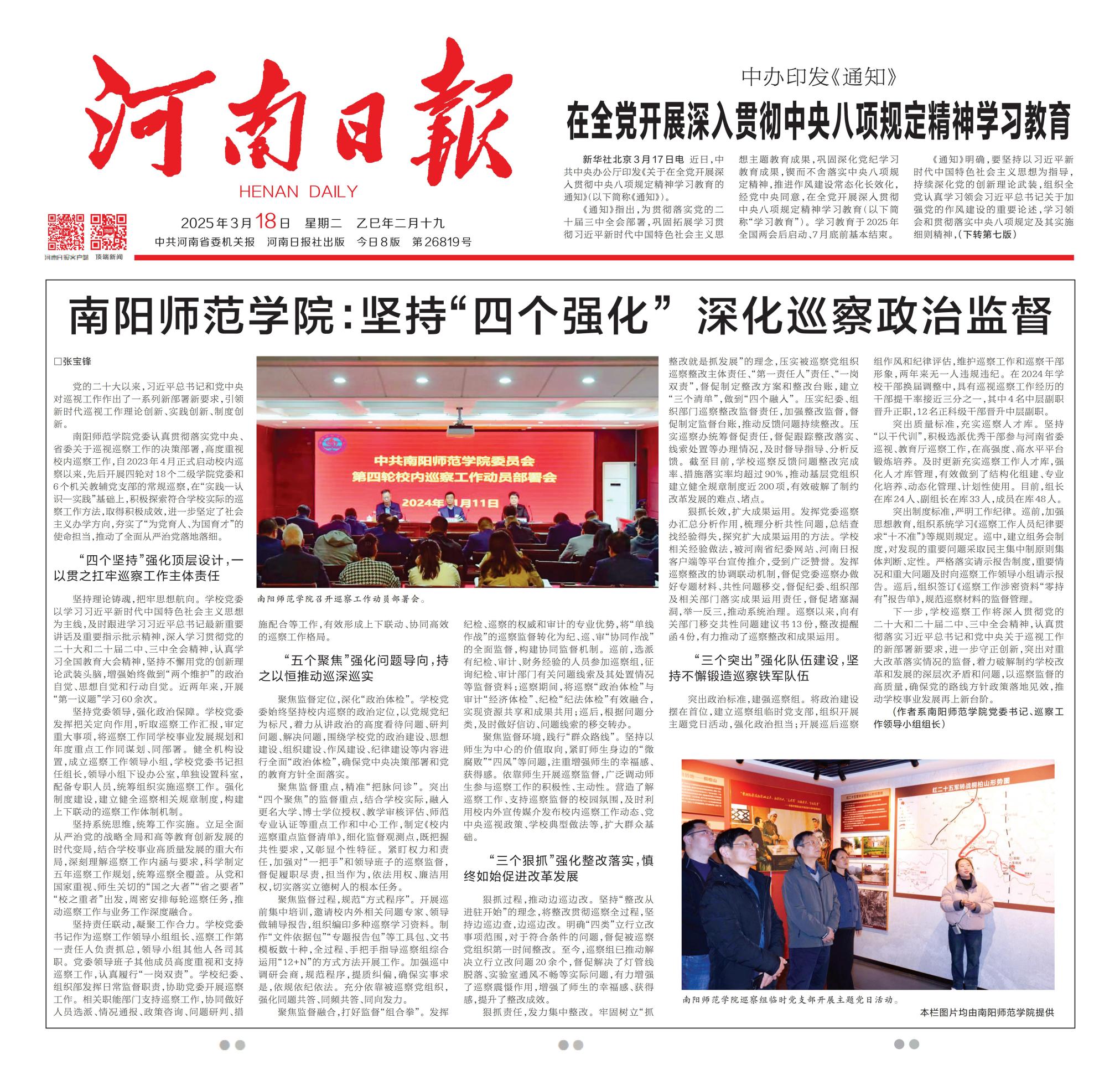 2025年3月18日,《河南日报》05版刊发校党委书记张宝锋的署名文章《华亿体育登录:坚持“四个强化” 深化巡察政治监督》,全文转载如下: